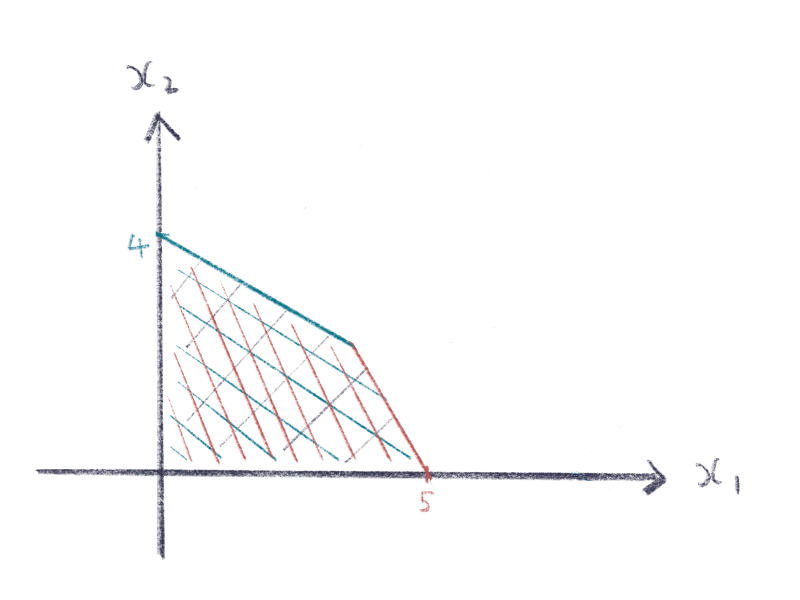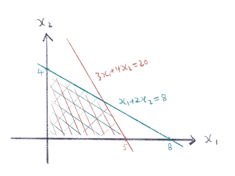 第二个约束条件 $3x_1 + 4x_2 \leq 20$,它表示直线 $3x_1 + 4x_2 = 20$ 的左半边部分。再把它跟前面的区域取交集。
