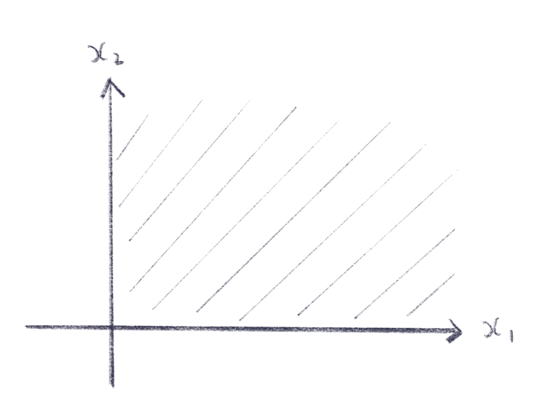 把 $x_1,x_2$ 看成平面的两条坐标轴,那么 $x_1\geq 0$ 和 $x_2\geq 0$ 就表示下面的区域。